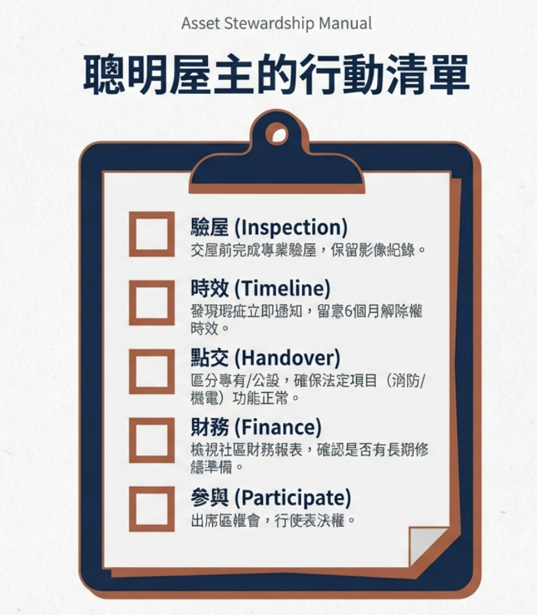 公寓大廈從公設點交開始,建築師即扮演關鍵技術專家,協助管委會精準查驗水電、消防及結構安全。在成立運作階段,建築師協助建立管理維護手冊,優化空間效能;進入整建維護時,更需具備專業規畫與法規簽認能力。