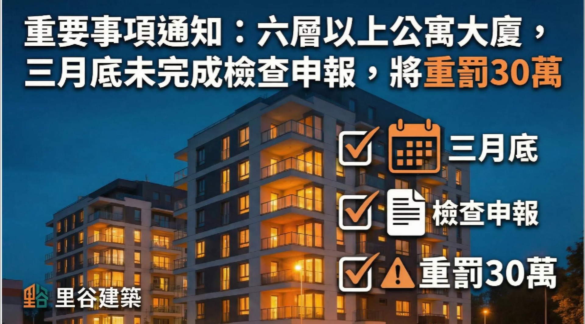 - 申報頻率:為讓住戶有足夠緩衝,不同規模有不同要求:16 樓以上每 2 年一次、8 至 15 樓每 3 年一次,而 6 至 7 樓建築則規定每 4 年申報 1 次。